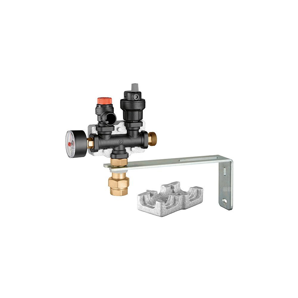 manometr, automatyczny zawór stopowy do naczynia wzbiorczego oraz wspornik mocujący.