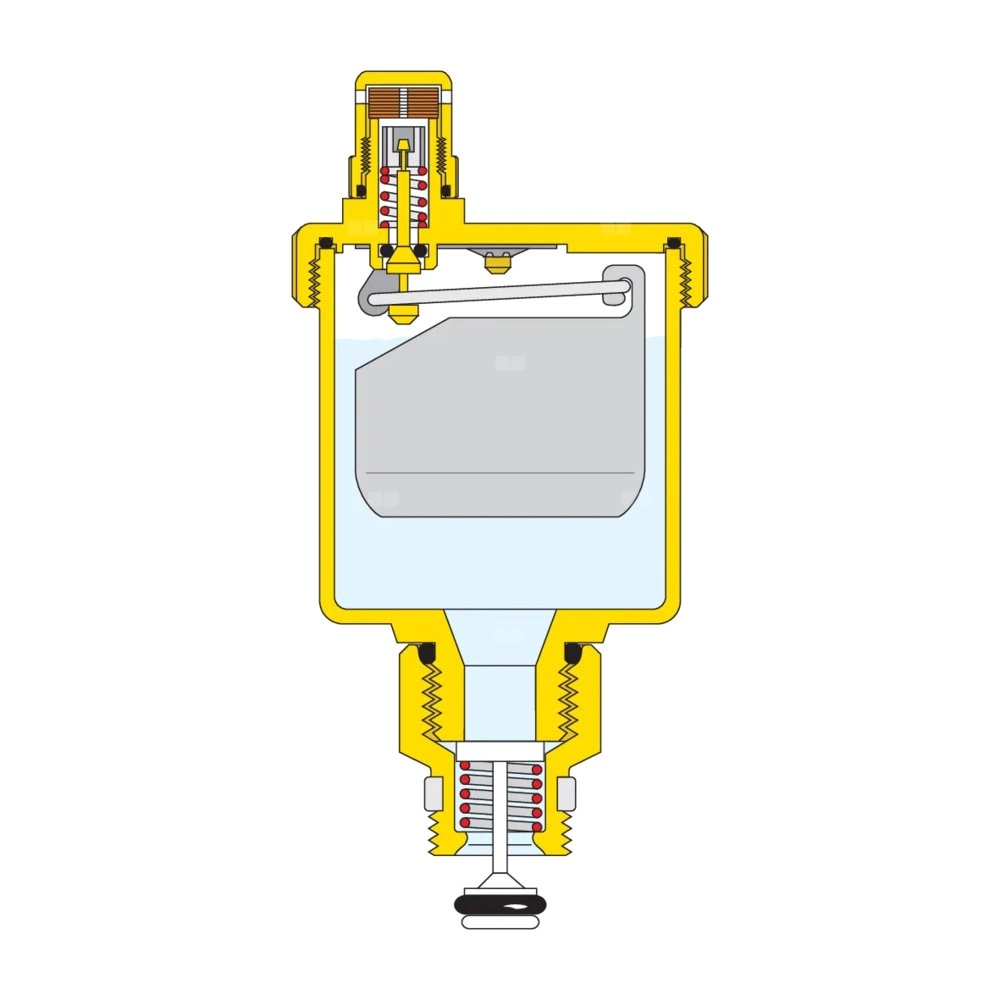 Automatyczny zawór odpowietrzający z zamknięciem higroskopijnym Przyłącze: G 1/2" A (ISO 228-1) GZ. Maksymalne ciśnienie pracy: 10 bar. Maksymalne ciśnienie upustowe: 2,5 bar. Zakres temperatury medium: 0–110 °C. Materiał: mosiądz.
