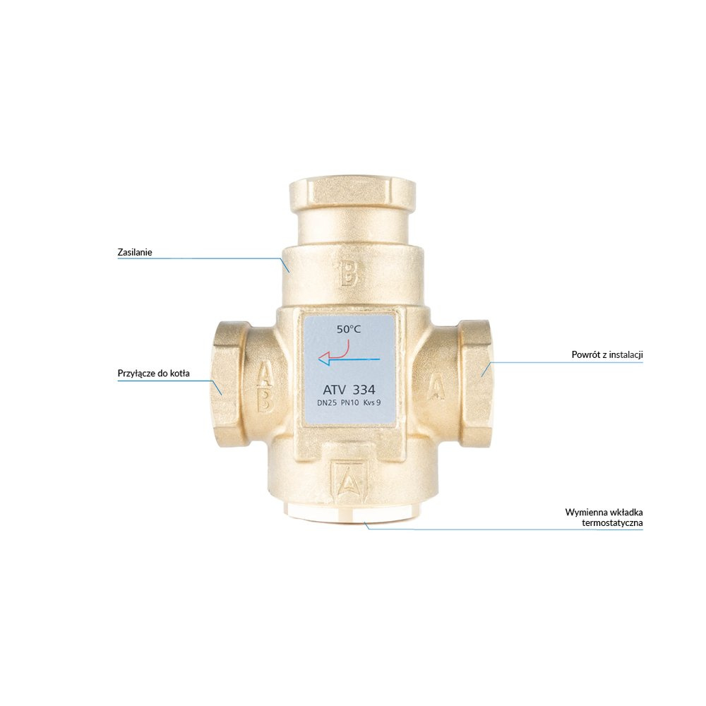 W instalacjach z kotłami stałopalnymi miesza lub rozdziela strumień medium. W przypadku funkcji mieszania ATV zabezpiecza kocioł przed korozją niskotemperaturową na skutek powrotu wody o zbyt niskiej temperaturze. W przypadku funkcji rozdzielania ATV rozdziela medium między powrotem do kotła a zasilaniem instalacji, umożliwiając wygrzanie kotła do odpowiedniej temperatury.