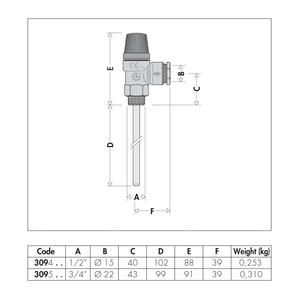 Zawór bezpieczeństwa temperaturowo-ciśnieniowy. Dla instalacji solarnych w celu ochrony zasobników c.w.u. 1/2" GZ x O 15 6 bar