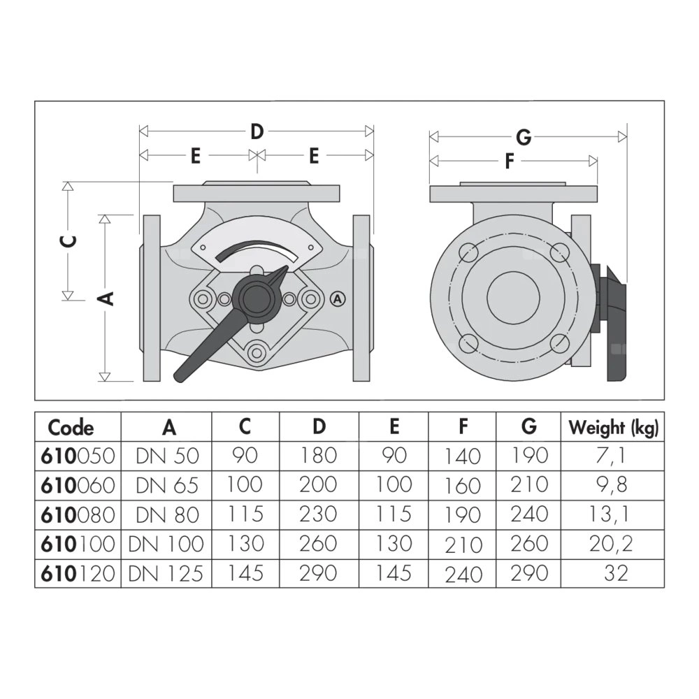 Zawór czterodrogowy mieszający z przepustnicą. Przyłącza kołnierzowe Ustawienie fabryczne: zasilanie ze źródła ciepła z prawej strony. Do stosowania w ciężkich warunkach. Przyłącze: DN 65 (EN 1092-1) PN 6. Maksymalne ciśnienie pracy: 6 bar. Zakres temperatury medium: 2–110 °C. PN (Ciśnienie nominalne): PN 6. Kv: 80 m³/h.
