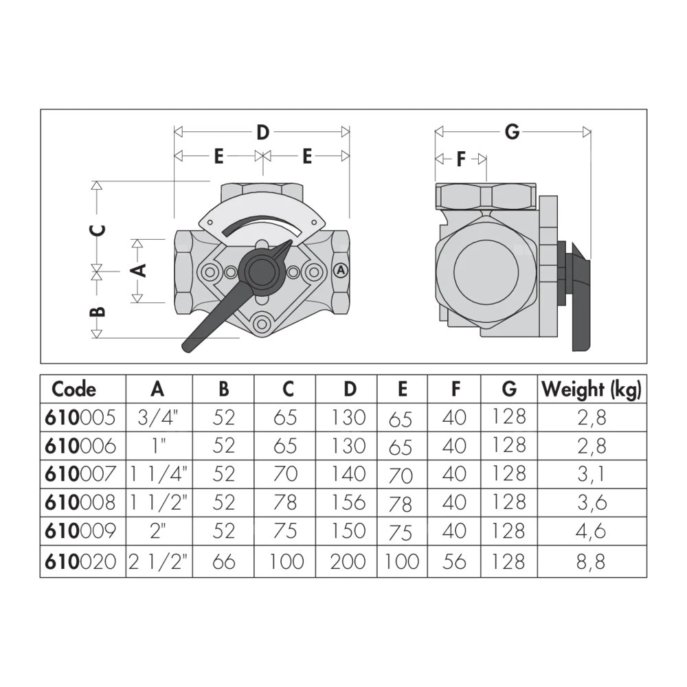 Zawór czterodrogowy mieszający z przepustnicą. Przyłącza gwintowane Ustawienie fabryczne: zasilanie ze źródła ciepła z prawej strony. Do stosowania w ciężkich warunkach. Przyłącze: G 1 1/2" (ISO 228-1) GW. Maksymalne ciśnienie pracy: 6 bar. Zakres temperatury medium: 2–110 °C. Kv: 30 m³/h.