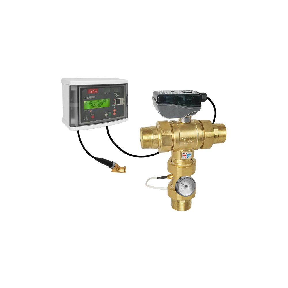 Elektroniczny zawór mieszający z programowalną dezynfekcją termiczną i dezynfekcją kontrolną 24 V. Przyłącza z gwintem zewnętrznym ze złączkami. Z mikroprzełącznikiem pomocniczym Zawiera: - trójdrożny zawór kulowy, - siłownik, - regulator, - czujnik temperatury wody zmieszanej, - czujnik temperatury wody cyrkulacyjnej. Możliwość zdalnego sterowania za pomocą protokołów RS-485 i MODBUS-RTU. Przyłącze: R 2" (EN 10226-1) GZ, wlot, złączka. Przyłącze: G 2" (ISO 228-1) GW, wylot. Maksymalne ciśnienie pracy: 10 bar. Zakres temperatury medium: 0–100 °C. Zakres regulacji temperatury: 20–85 °C. Zakres temperatury dezynfekcji: 40–85 °C. Zasilanie elektryczne: 24 V (AC). Pobór mocy: (6,5+6) VA. Stopień ochrony: IP 65. Kv: 41,0 m³/h.