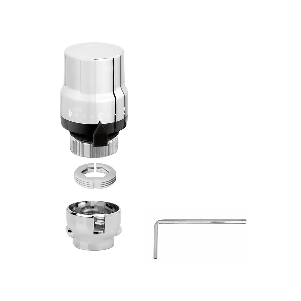 Głowica termostatyczna do armatury grzejnikowej dekoracyjnej. Z wbudowanym czujnikiem, elementem zabezpieczającym przed zmianą n