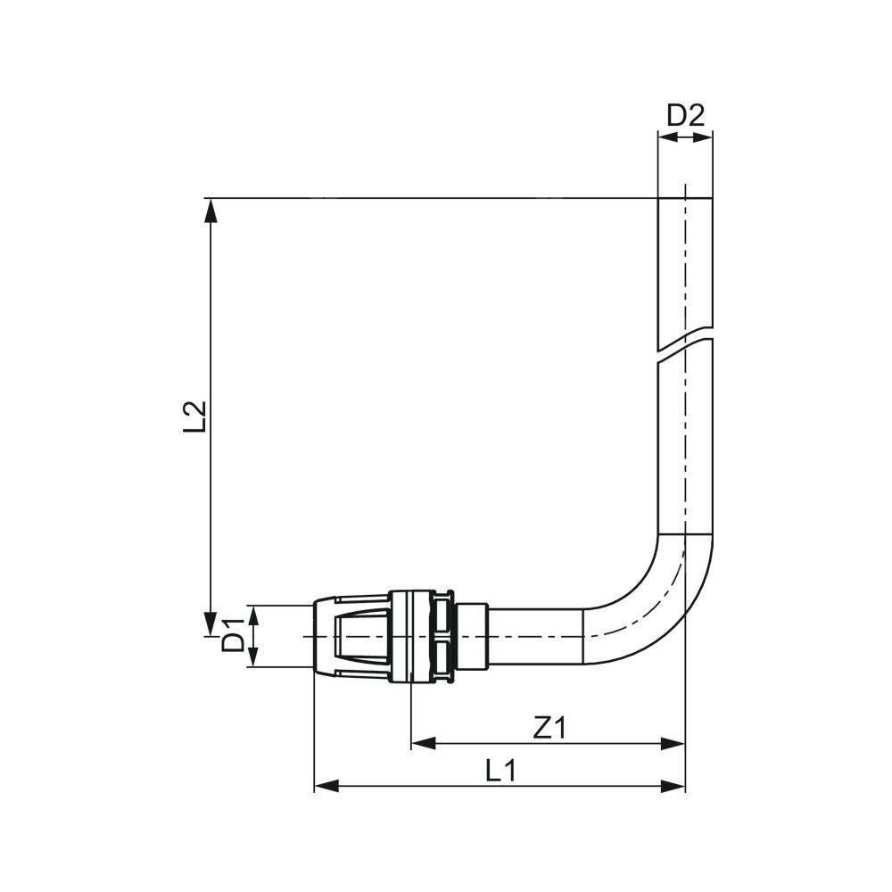 Kolano montażowe do grzejników z połączeniem wtykowym. Do instalacji grzewczych. Rurka miedziana 15 mm, niklowana, długość 289 mm.