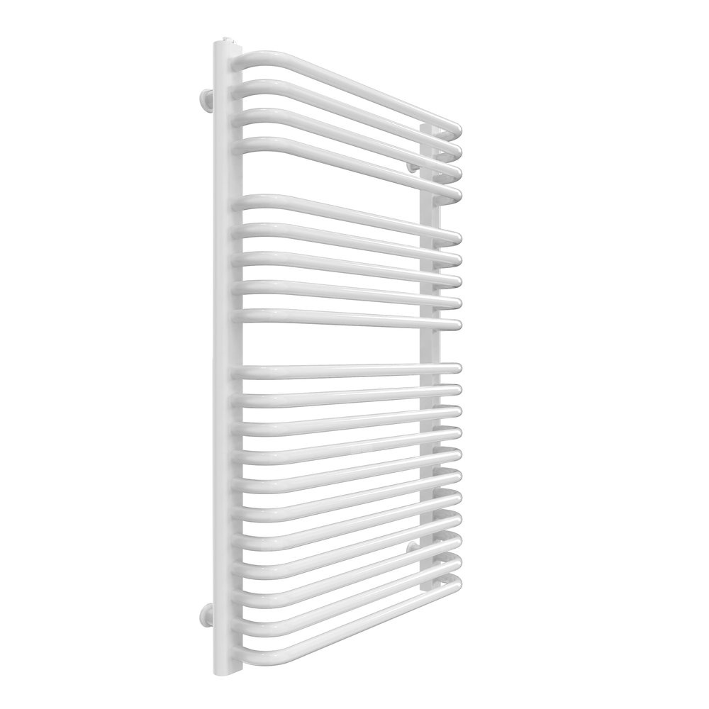 Grzejnik drabinkowy stalowy o poprzeczkach wyprofilowanych w kształcie litery C. Kolektory wykonane z profili o kształcie litery D. Malowany proszkowo, wyposażony w komplet uchwytów, korek oraz odpowietrznik. Moc podana przy parametrach 75/65/20°C.