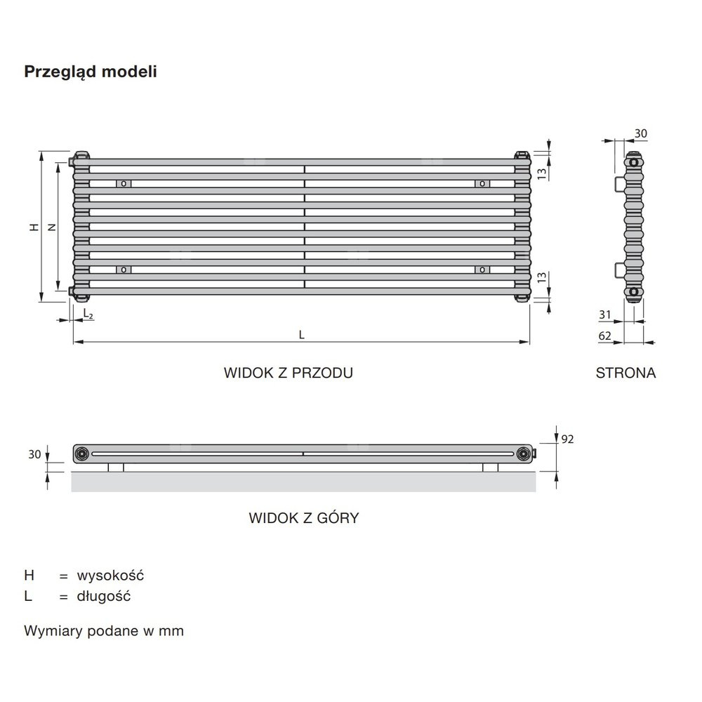 Kermi® Niva pozioma NH2L1 głebokosc 75 mm wysokosc 550 mm długosc 820 mm kod koloru pierwszy kolor kolor RAL 9016 Połysk standardowy