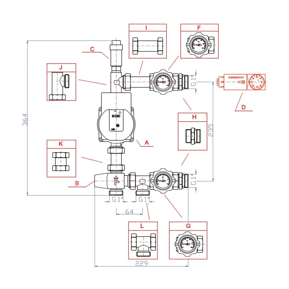 Seria W40 w której w skład wchodzą: A - pompa Wilo Yonos Para Premium 15/6 B - Zawór 3D ESBE erii VTA C - odpowietrznik automatyczny z zaworem stopowym D - termostat przylgowy bimetaliczny +20°C/+90°C F G - zawory kulowe z termometrem H I J K L - zestaw kształtek mosiężnych