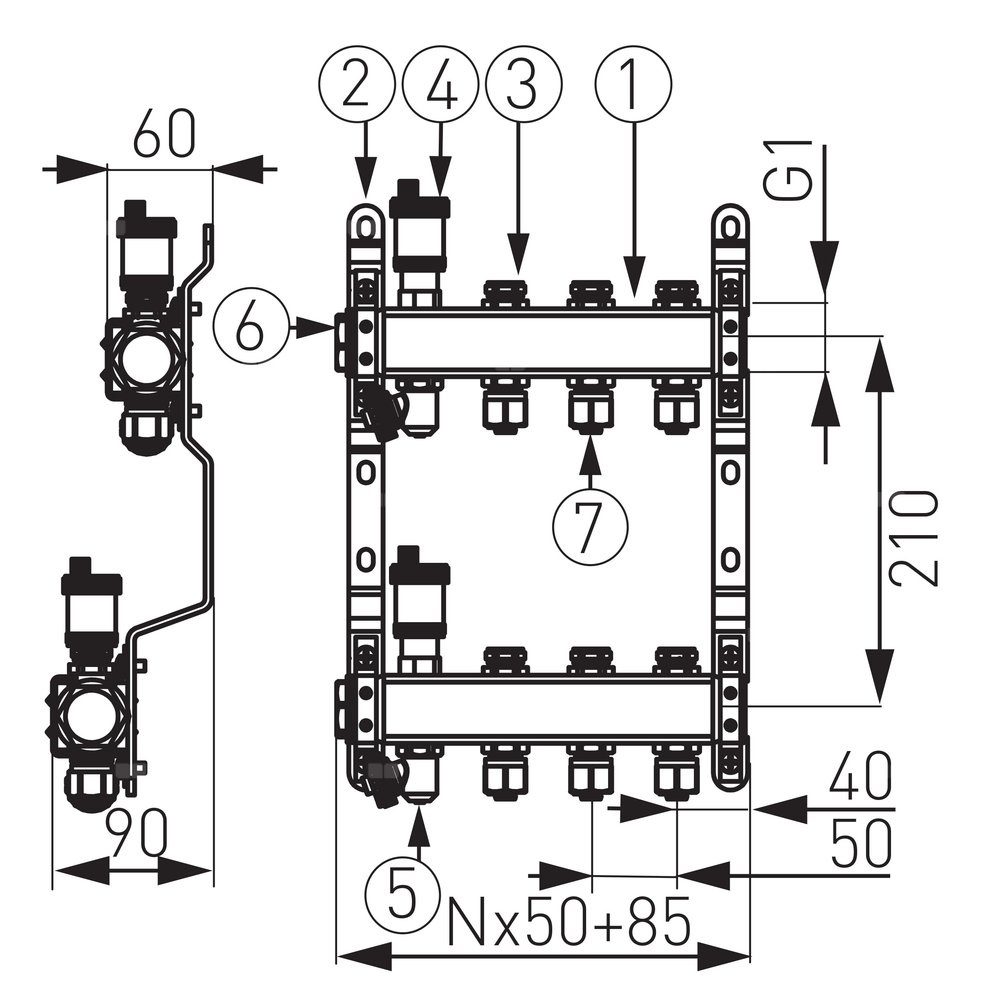 Rozdzielacz 7-drogowy (do systemów c.o. i c.w.u.) z zaworami odcinającymi obwody, ze złączkami, stal nierdzewna
