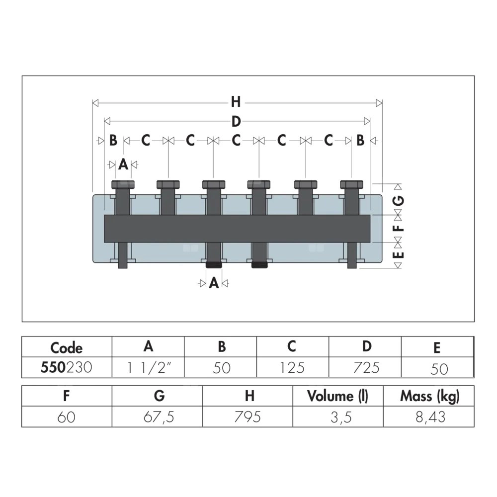 Rozdzielacz do instalacji grzewczych i chłodniczych. 3 wyjścia. Z izolacją. W komplecie ze wspornikami ze stali. główne podłączenie: G 1 1/2" A (ISO 228-1) GZ. przyłącza wylot: G 1 1/2" (ISO 228-1) GW, 3 wyjścia , nakrętka mocująca. Maksymalne ciśnienie pracy: 6 bar. Zakres temperatury medium: 5–110 °C. Rozstaw przyłączy głównych: 125 mm. Materiał: stal.