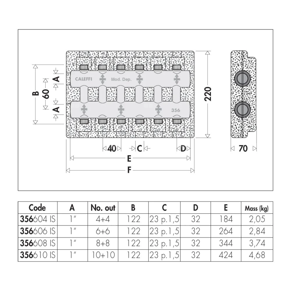 Rozdzielacz podwójny - monoblok Z izolacją. Dla instalacji grzewczych i chłodniczych. Przyłącze: G 1" (ISO 228-1) GW, Podłączenie do złączek Caleffi. przyłącza wylot: 23 p.1,5, 10 wyjść. Maksymalne ciśnienie pracy: 10 bar. Zakres temperatury medium: 0–100 °C. Rozstaw przyłączy głównych: 60 mm. Rozstaw wyjść: 40 mm.