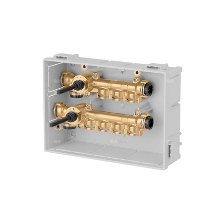 Rozdzielacz z głównymi zaworami odcinającymi Zawiera: -parę rozdzielaczy; -skrzynkę rozdzielacza (270 x 190 x 80) wyposażoną we wsporniki i elementy mocujące; -pokrywę zabezpieczającą w trakcie montażu; -4 zaślepki z klipsami mocującymi. przyłącze ciepła wylot: 3 wyjścia , podłączenie zaciskowe. przyłącze zimna wylot: 4 wyjścia , podłączenie zaciskowe. Maksymalne ciśnienie pracy: 10 bar. Zakres temperatury medium: 5–90 °C. Rozstaw wyjść: 32 mm. Materiał: mosiądz.