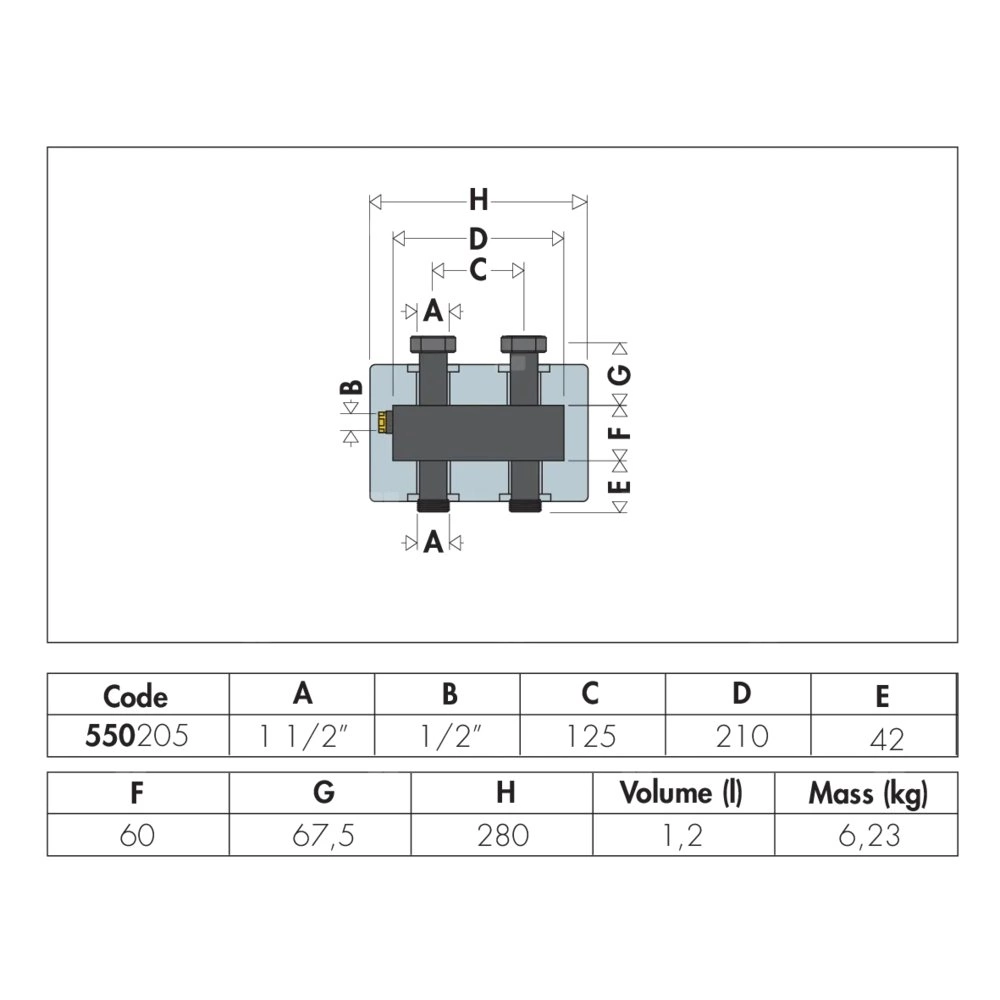 Sprzęgło hydrauliczne do instalacji grzewczych i chłodniczych. Z izolacją. główne podłączenie: G 1 1/2" A (ISO 228-1) GZ. przyłącza wylot: G 1 1/2" (ISO 228-1) GW, 1 wyjście, nakrętka mocująca. Maksymalne ciśnienie pracy: 6 bar. Zakres temperatury medium: 5–110 °C. Rozstaw przyłączy głównych: 125 mm. Materiał: stal.