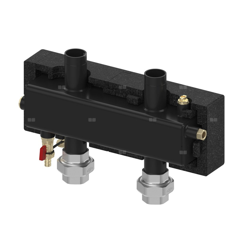 Do montażu w poziomie, lub w pionie, z manualnym odpowietrznikiem i zaworem spustowym ze złączką do węża i kapą, tuleja zanurzeniowa 3/8" GW (średnica wewnętrzna 10 mm) do czujnika temperatury na zasilaniu, przyłącza gwintowe 1 1/2" GZ (góra) i śrubunki 1 1/2" GW (obieg kotłowy), komplet z izolacją.