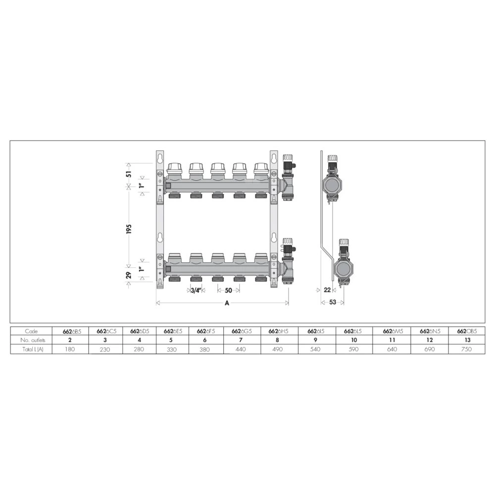 Zespół rozdzielaczy. Zawiera: -rozdzielacz powrotny z zaworami odcinającymi z możliwością przyłączenia siłownika termoelektrycznego; - rozdzielacz zasilający z zaworami do wstępnej regulacji natężenia przepływu; - zakończenia rozdzielacza z ręcznymi zaworami odpowietrzającymi i korkami; - uchwyty montażowe z polimeru z możliwością regulacji rozstawu do użycia ze skrzynką serii 659 lub 661 lub do montażu bezpośrednio na ścianie. Przyłącze: G 1" (ISO 228-1) GW, Podłączenie do złączek Caleffi. przyłącza wylot: G 3/4" A (ISO 228-1) GZ, 10 wyjść. Maksymalne ciśnienie pracy: 10 bar. Zakres temperatury medium: 5–100 °C. Rozstaw wyjść: 50 mm.