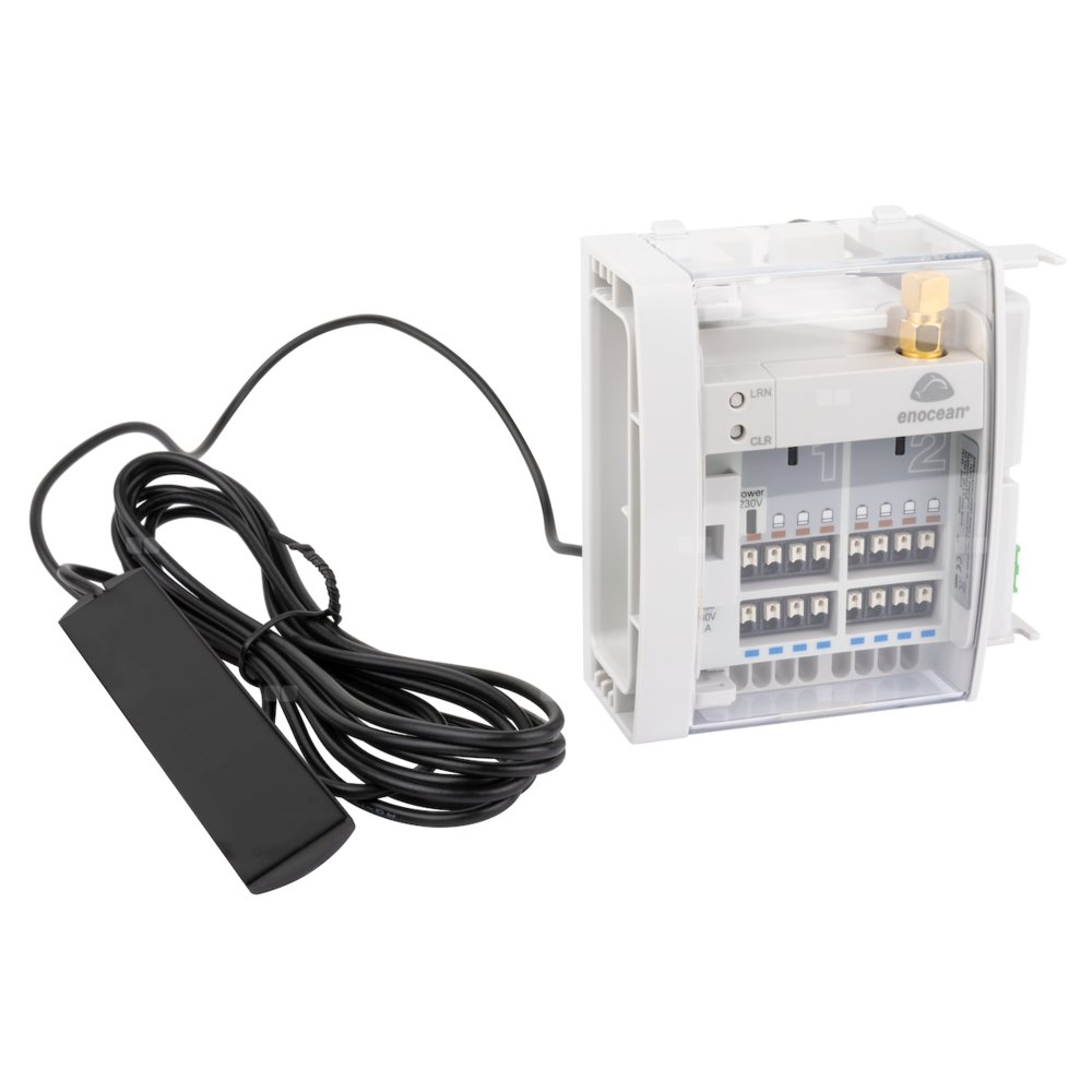 Antena zewnętrzna wyprowadza odbiornik sygnału EnOcean poza szafkę rozdzielacza, poprawiając zasięg.
