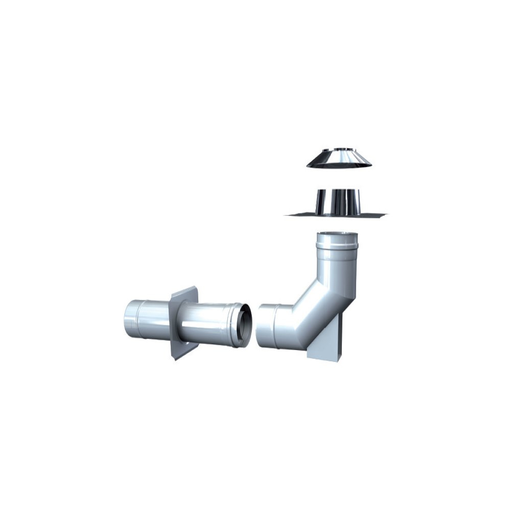 Pakiet składający się z rury malowanej RT PSI, rozety ściennej RS, kolana z podparciem ŁPKKI, płyty dachowej DHS i kołnierza przeciwdeszczowego RKP.