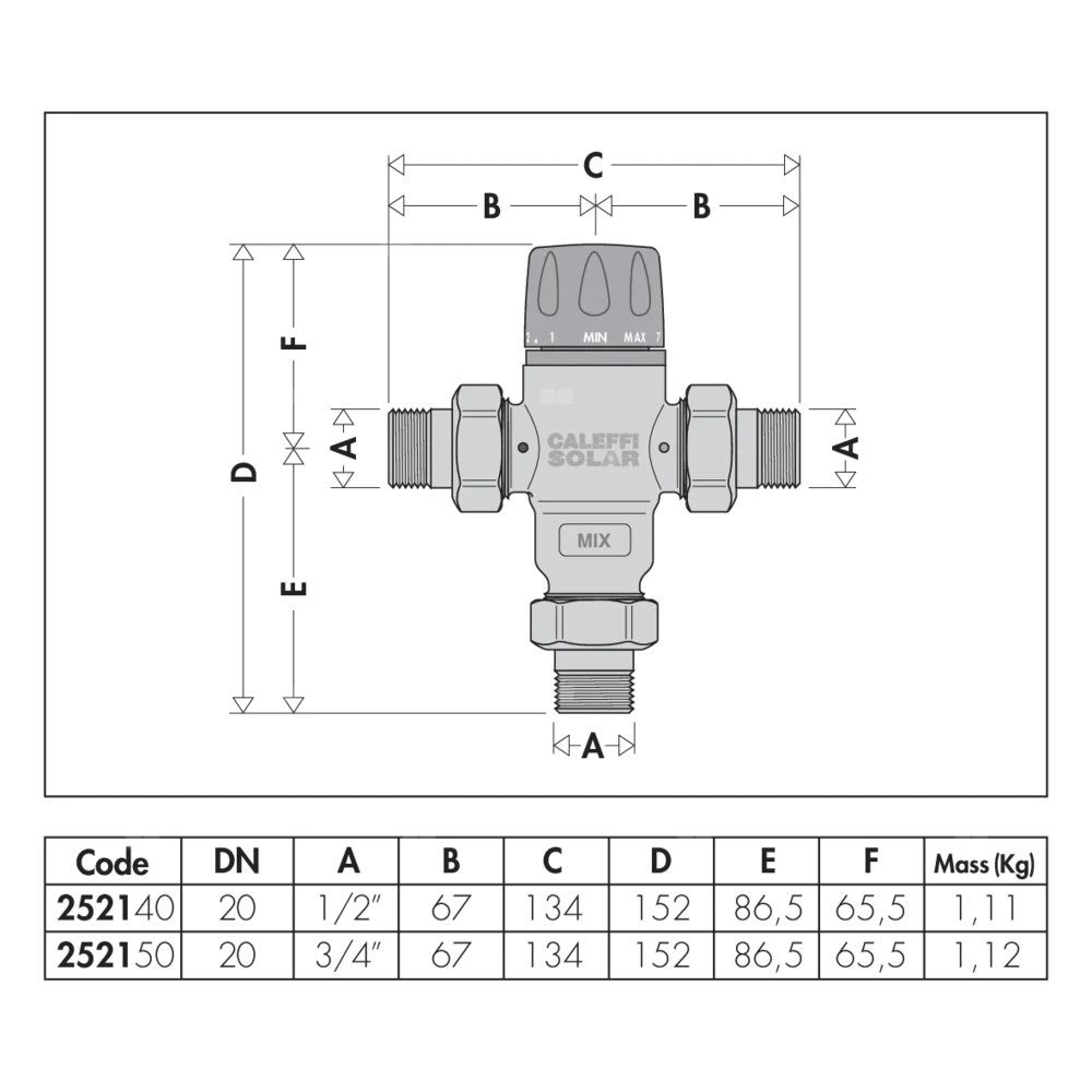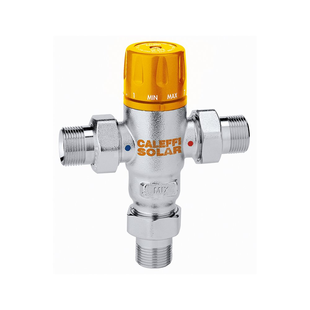 Regulowany termostatyczny zawór mieszający, do instalacji solarnych Przyłącze: G 1/2" A (ISO 228-1) GZ, złączka. Maksymalne ciśnienie pracy: 14 bar. Zakres temperatury medium: 0–100 °C. Zakres regulacji temperatury: 30–65 °C. Wykończenie: chromowane. Kv: 2,6 m³/h. Materiał: stop mosiądzu odporny na odcynkowanie.