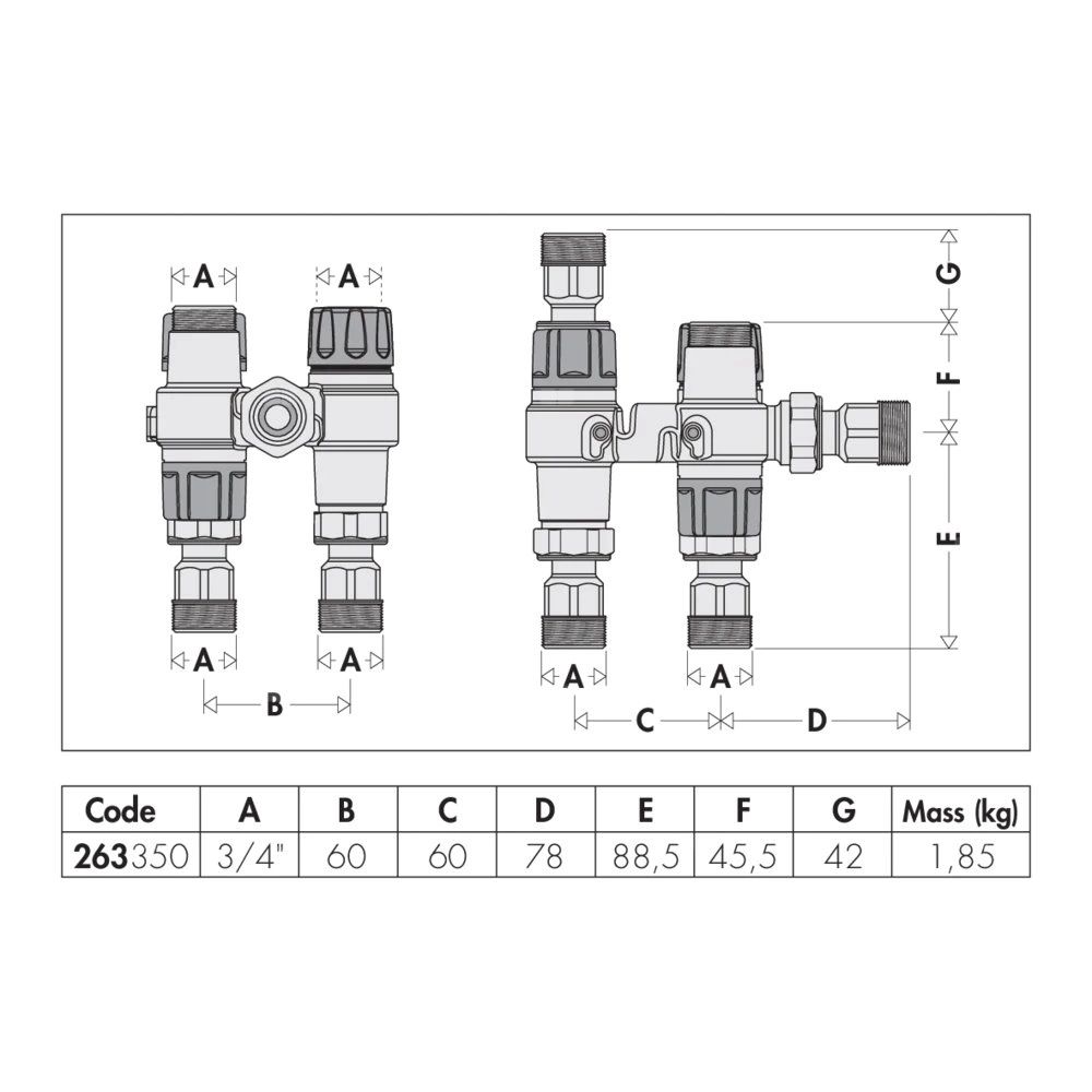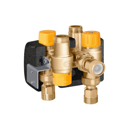- termostatyczny antyoparzeniowy zawór mieszający regulowany przy użyciu pokrętła. Wyposażony w filtry i zawory zwrotne na wlotach;