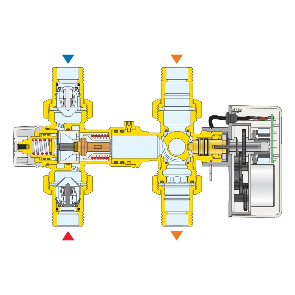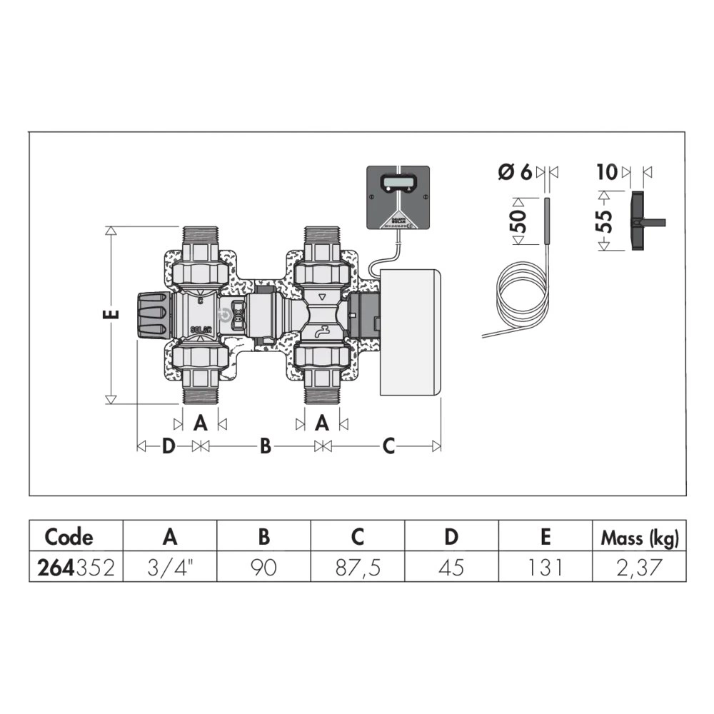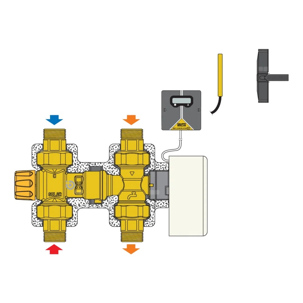 Zestaw połączeniowy zasobnika z kotłem z rozdzielonymi termicznie obiegami Z mikroprzełącznikiem pomocniczym Zawiera: -termostatyczny antyoparzeniowy zawór mieszający regulowany przy użyciu pokrętła; -filtry i zawory zwrotne na wlotach; -zawór rozdzielający z siłownikiem trzypunktowym z mikroprzełącznikiem pomocniczym; -termostat z czujnikiem do instalacji solarnych dla zaworu rozdzielającego; -wyświetlacz temperatury; -obudowę zabezpieczającą; -połączenie zaworu rozdzielającego z zaworem mieszającym z regulowaną pozycją złącz wlotowych i wylotowych. Przyłącze: G 3/4" A (ISO 228-1) GZ. Maksymalne ciśnienie pracy: 10 bar. Zakres temperatury medium: -5–110 °C. Zakres regulacji temperatury: 35–55 °C. Zasilanie elektryczne: 230 V (AC). Materiał: stop mosiądzu odporny na odcynkowanie z niską zawartością ołowiu.