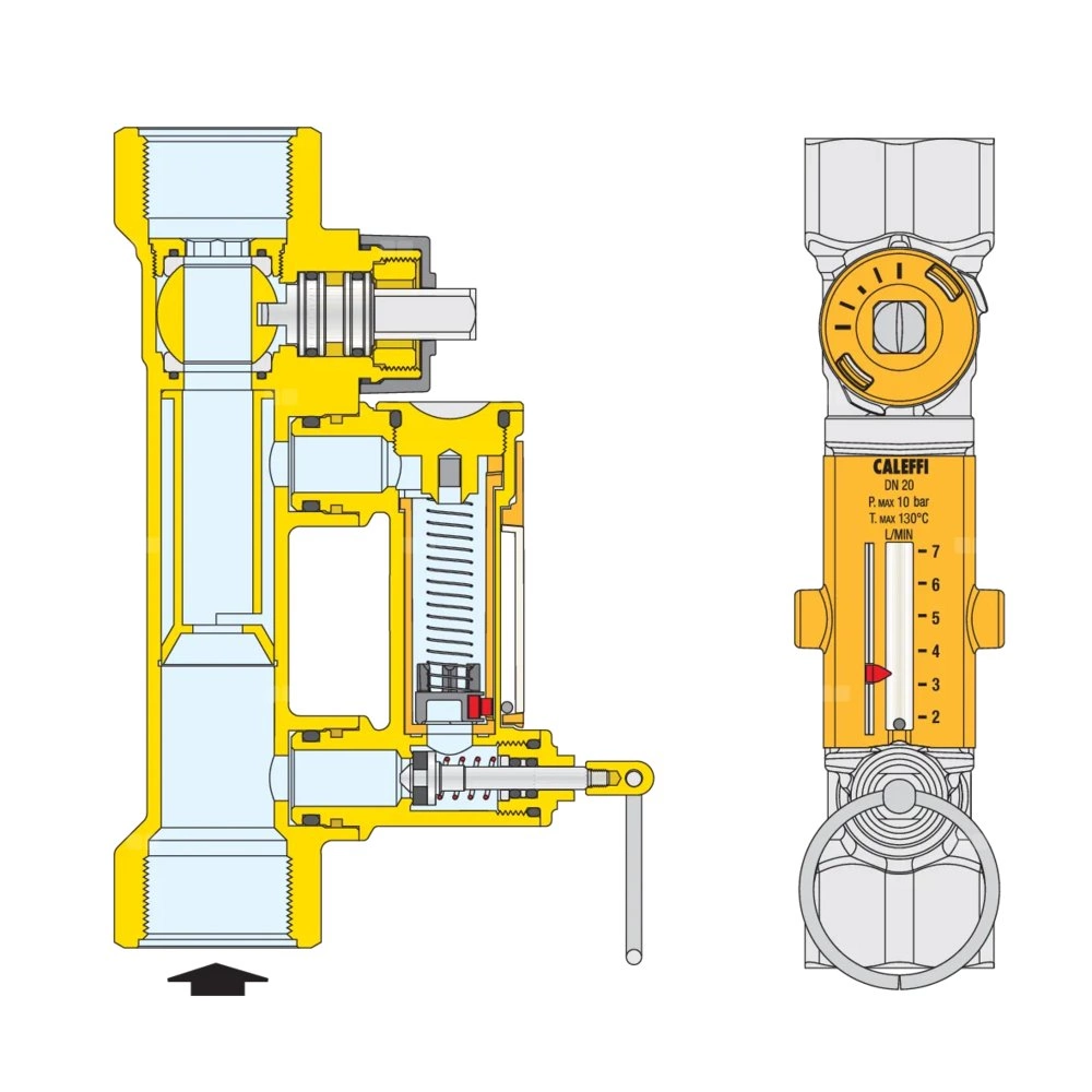 Zawór równoważący z przepływomierzem, do instalacji solarnych Z izolacją. Bezpośredni odczyt natężenia przepływu. Zawór kulowy do regulacji natężenia przepływu. Skala przepływomierza z podziałką oraz magnetycznym wskaźnikiem natężenia przepływu. Przyłącze: G 3/4" (ISO 228-1) GW. Maksymalne ciśnienie pracy: 10 bar. Zakres temperatury medium: -30–130 °C. Wykończenie: chromowane. Maksymalne stężenie glikolu: 50 %. Medium: woda, Roztwory glikolu. Zakres roboczego natężenia przepływu: 2–7 l/min. Materiał: mosiądz.