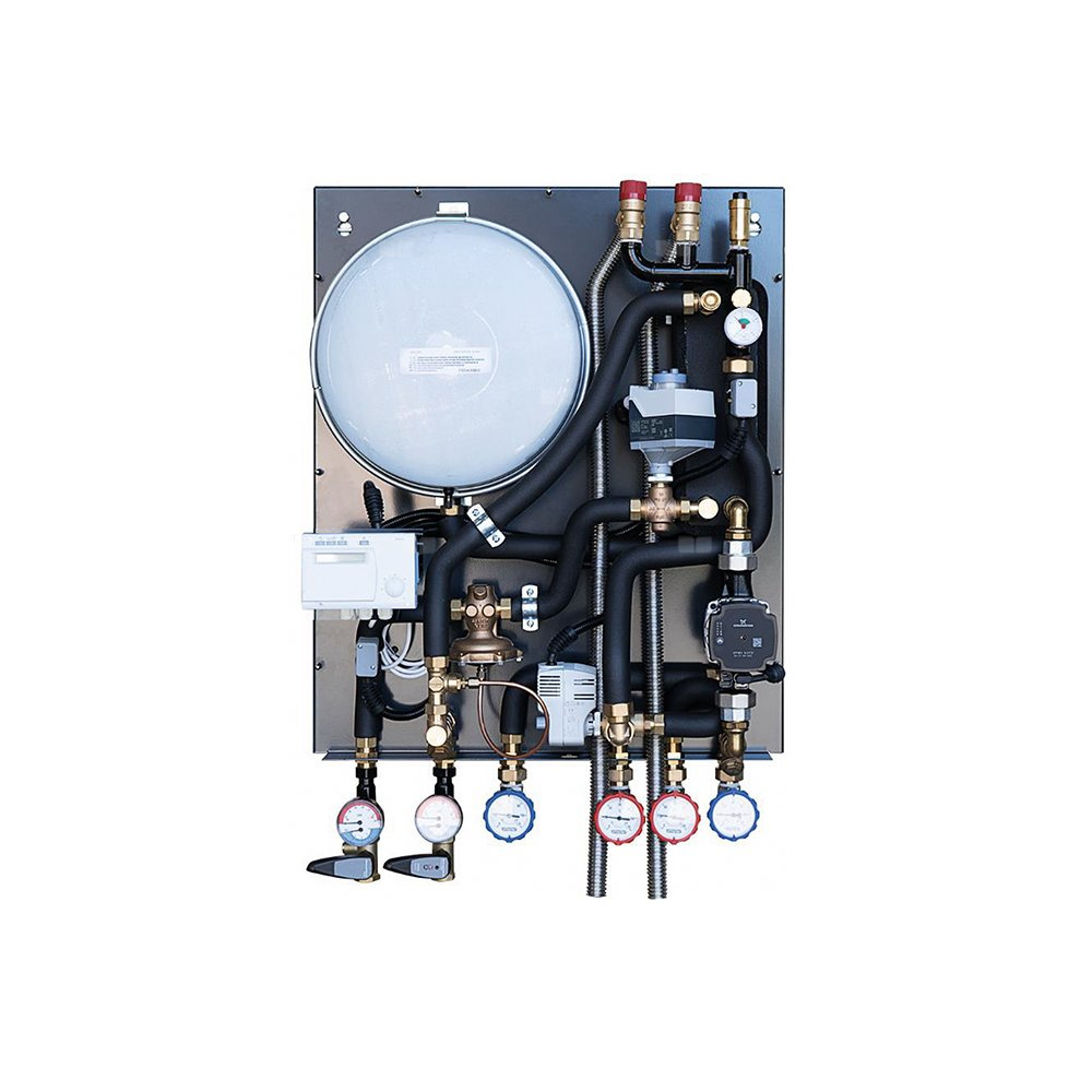 Składa się z: zaworów kulowych odcinających, zaworu różnicy ciśnień, wymiennika 30-płytowego, zaworu regulacyjnego, siłownika, 2 zaworów bezpieczeństwa c.o. 3 bary, manometrów, termometrów, pompy UPML AUTO 25-95, obudowy, regulatora pokojowego, naczynia przeponowego 24 I, izolacji. Max. moc dla c.o. 50 kW.
