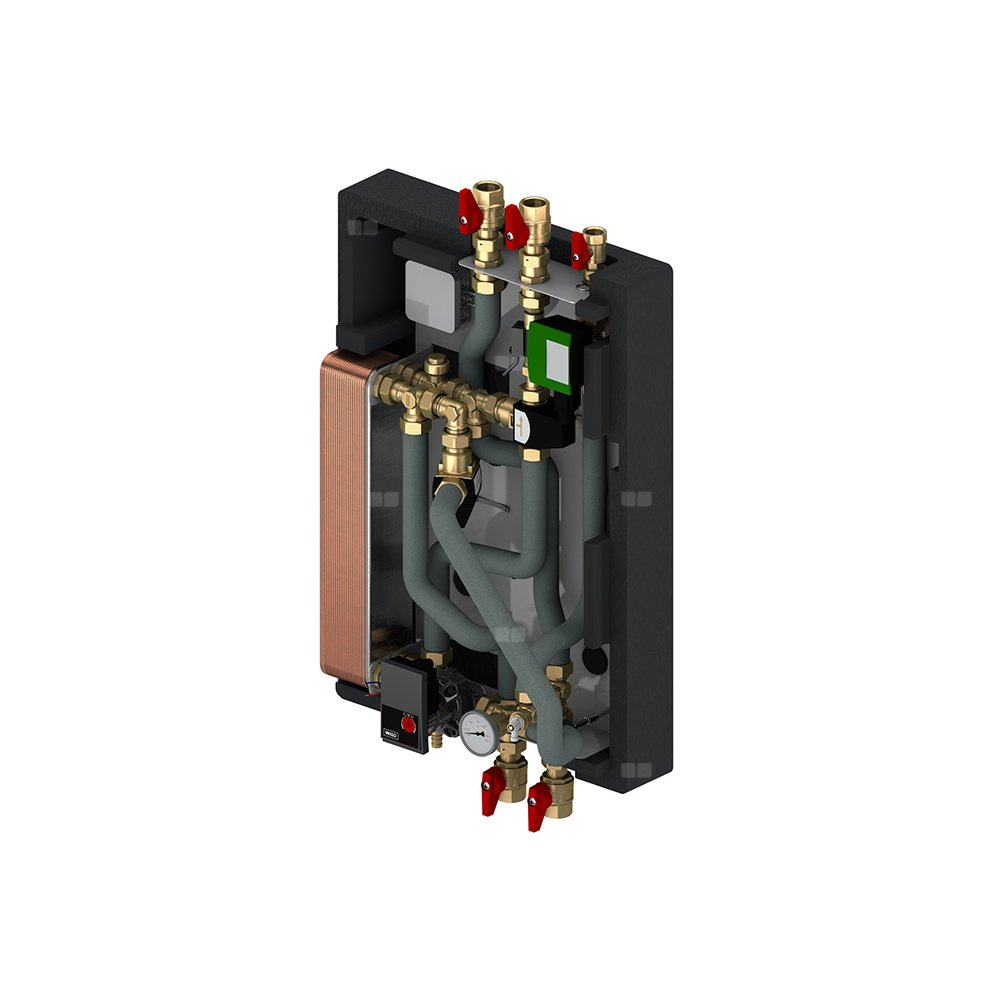 Kompaktowa stacja Logofresh z termostatyczną regulacją, przygotowana do montażu naściennego lub na zasobniku.