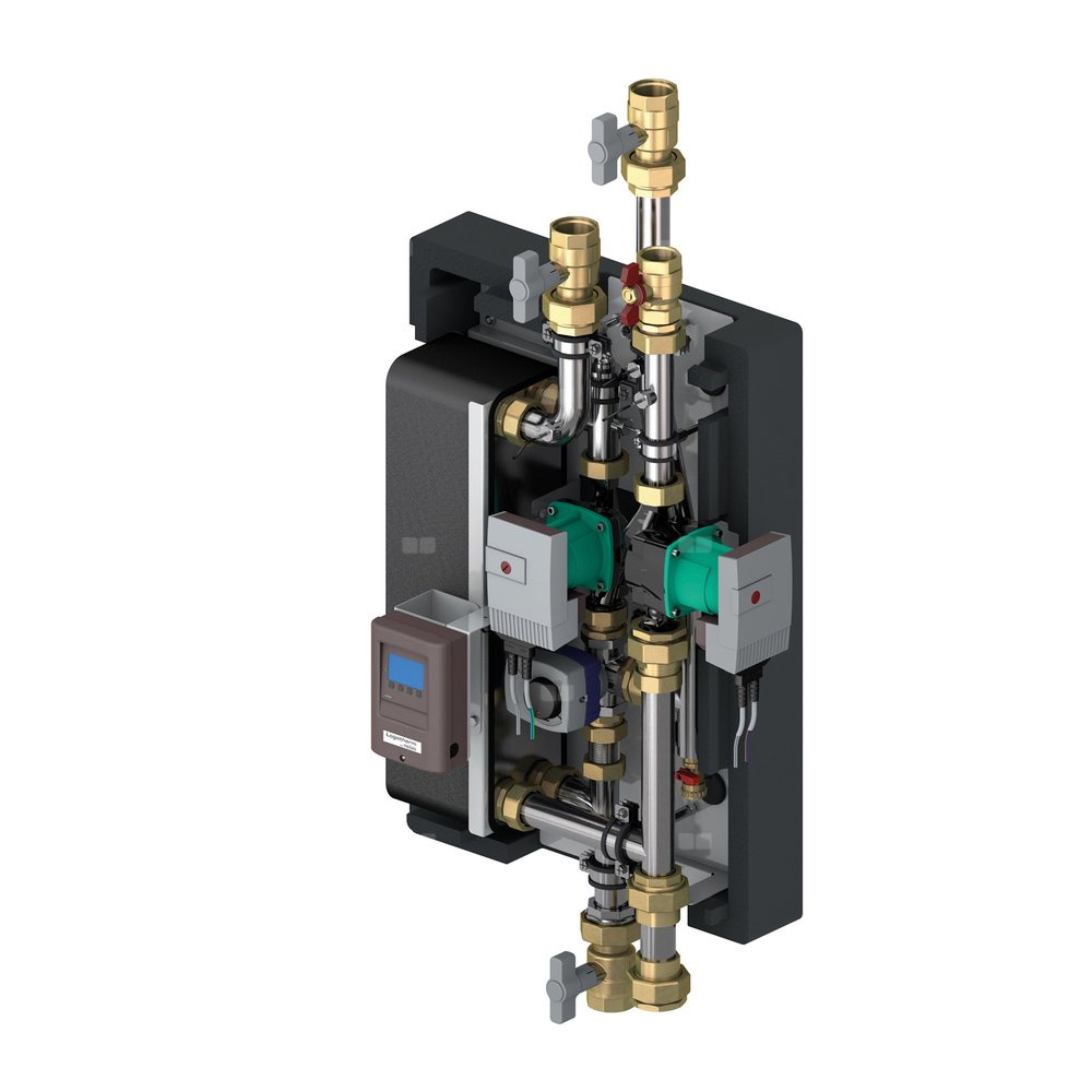 Możliwość odpowietrzenia, zawór spustowy, przepływomierz, wszystkie elementy na zmontowane na płycie w obudowie EPP termoizolacyjnej.