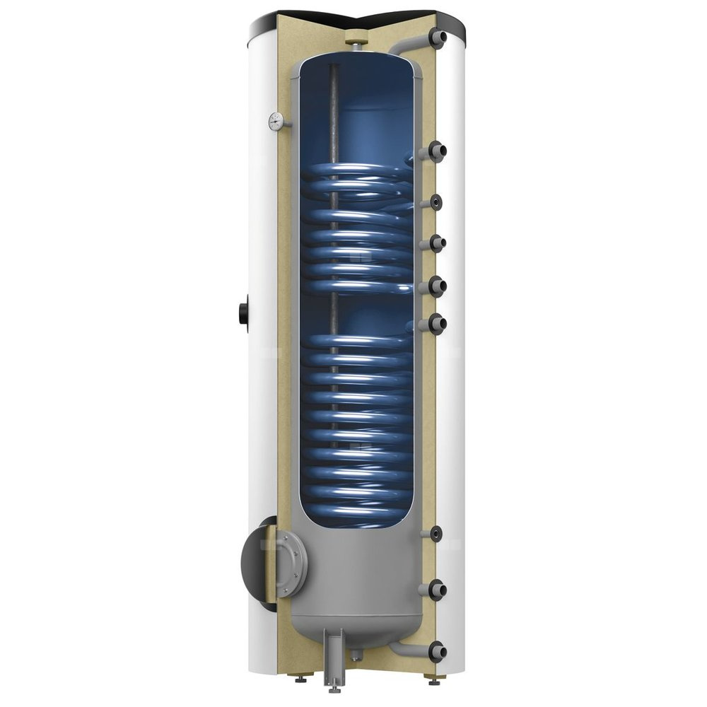 Podgrzewacz ciepłej wody użytkowej, wspomagany z instalacji solarnej, w wersji stojącej, z dwiema wężownicami.