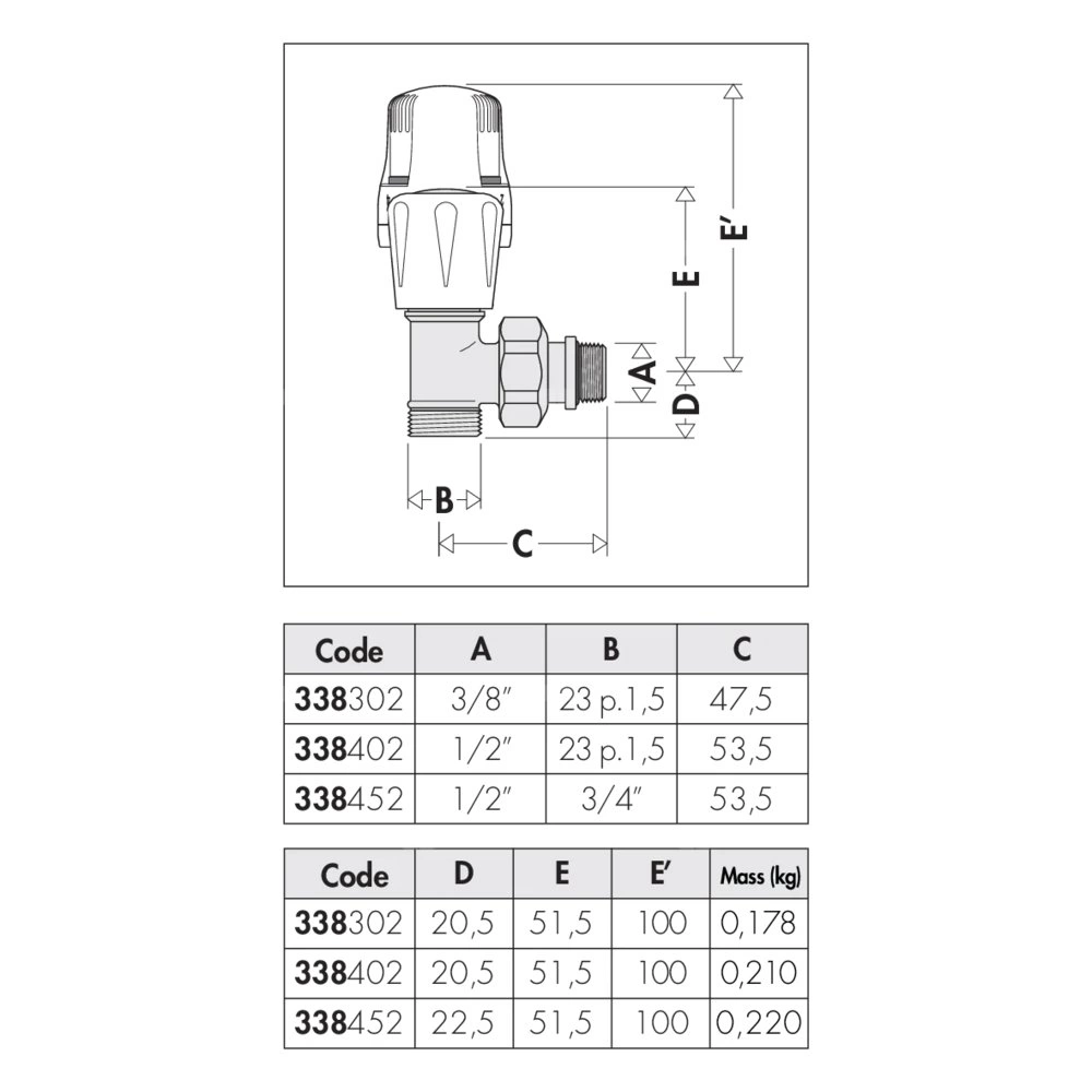 Kątowy grzejnikowy zawór termostatyczny z pokrętłem, przystosowany do montażu głowic termostatycznych, elektronicznych i siłowników termoelektrycznych podłącznie rury: 23 p. 1,5, wlot, podłączenie kątowe, Podłączenie do złączek Caleffi. podłączenie grzejnika: G 3/8" A (ISO 228-1) GZ, wylot, podłączenie kątowe. Maksymalne ciśnienie pracy: 10 bar. Zakres temperatury medium: 5–100 °C. Wykończenie: chromowane. Kv: 2,22 m³/h. Materiał: mosiądz.
