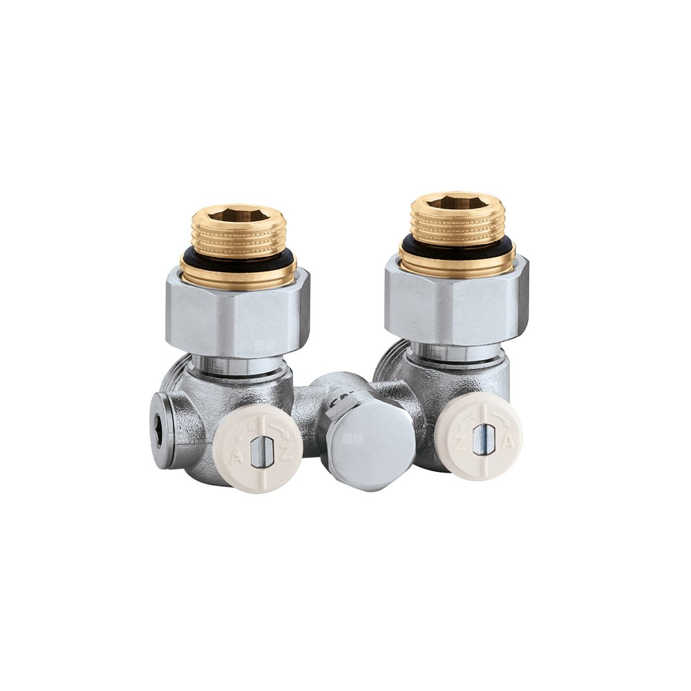 Podwójny zawór podłączeniowy do grzejników stalowych z wkładką termostatyczną. Wersja jednorurowa kątowa - 1/2" GZ
