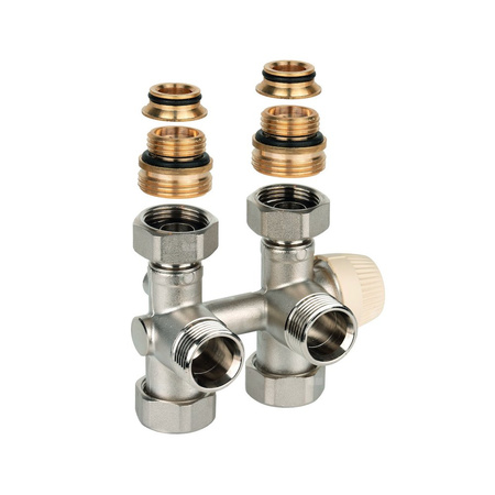 Zawór podwójny Therafix Uniwersal z zespolonym zaworem termostatycznym z wkładką SX, przyłącze grzejnika 3/4" gza., uszczelnienie płaskie plus stożek, w zestawie nypel redukcyjny na 1/2" oraz osłona ozdobna: chrom
