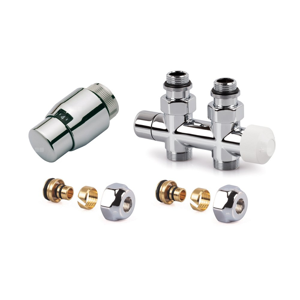 Zestaw CHROM do grzejników dolnozasilanych: głowica Thera-200 (chroma/chrom) T4221, zawór podwójny, prosty, V2882DSL15A + 2x złączka do rur wielowarstwowych FEM24M16X2