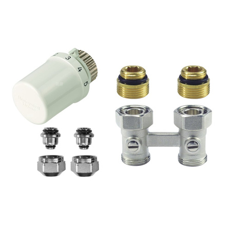Zestaw do grzejników dolnozasilanych: głowica Thera-6 T3019W0, zawór podwójny, prosty, podwójny, z odcięciem, 1/2" V2495DY015 + złączka do rur wielowarstwowych OT113M-3/4F
