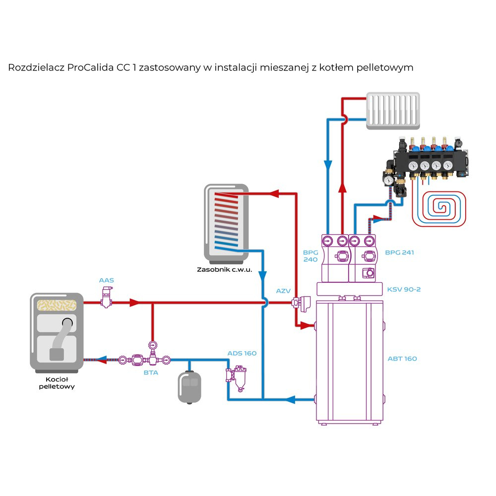 Rozprowadza ciepło / chłód ze źródła na poszczególne pętle instalacji płaszczyznowej.