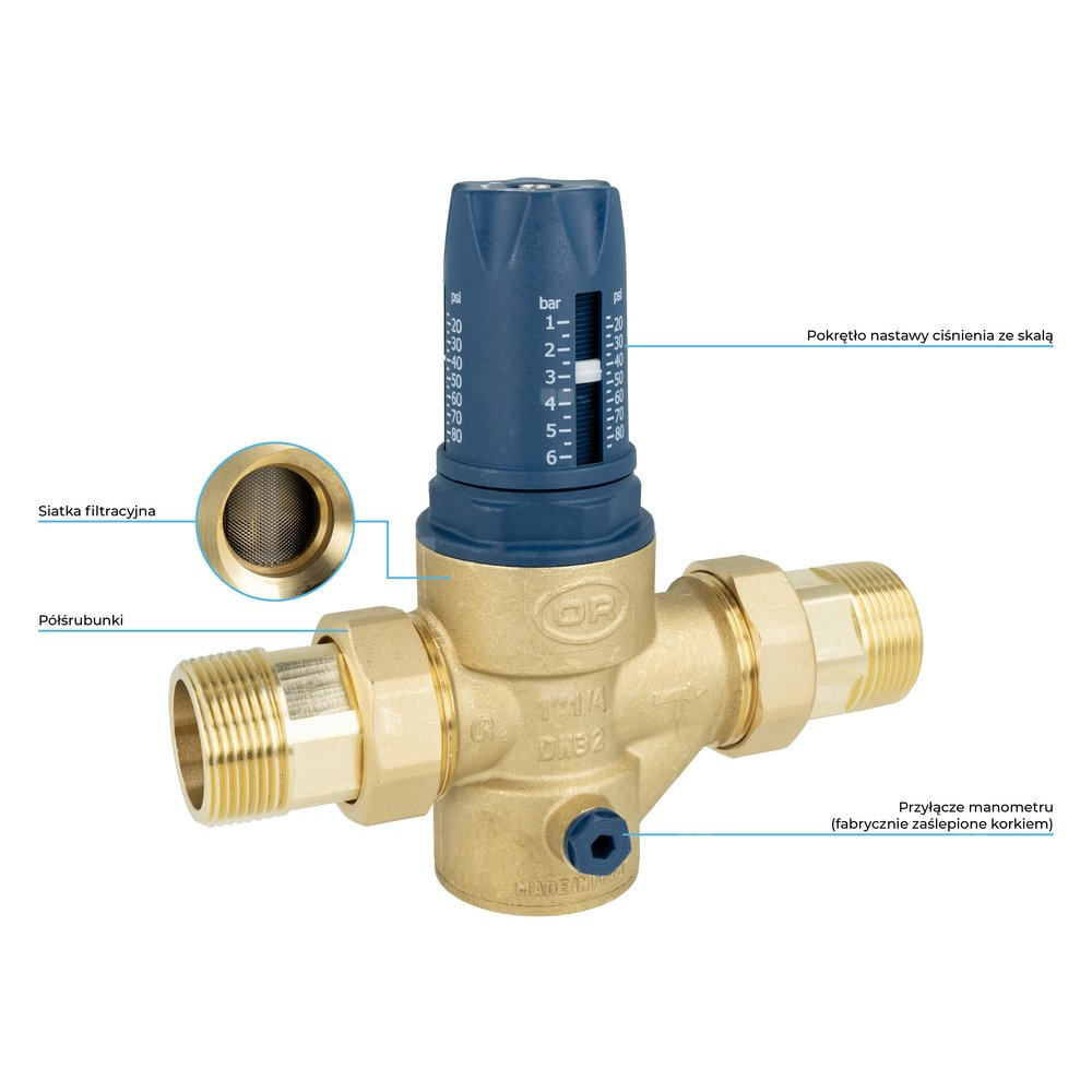 Obniża i stabilizuje ciśnienie wody do ustawionej wartości niezależnie od zmian ciśnienia na wlocie do reduktora.