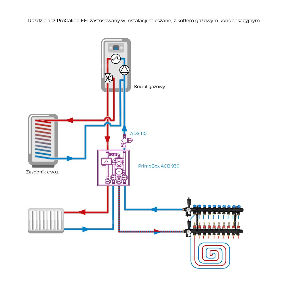 Rozprowadza ciepło/chłód ze źródła na poszczególne pętle instalacji płaszczyznowej.