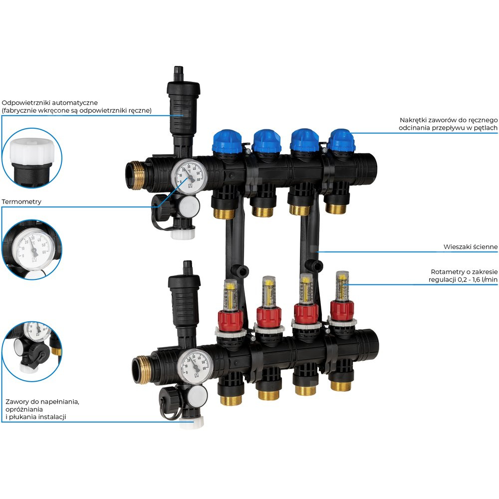 Termometry na każdej belce umożliwiają kontrolę temperatury na zasilaniu i powrocie.