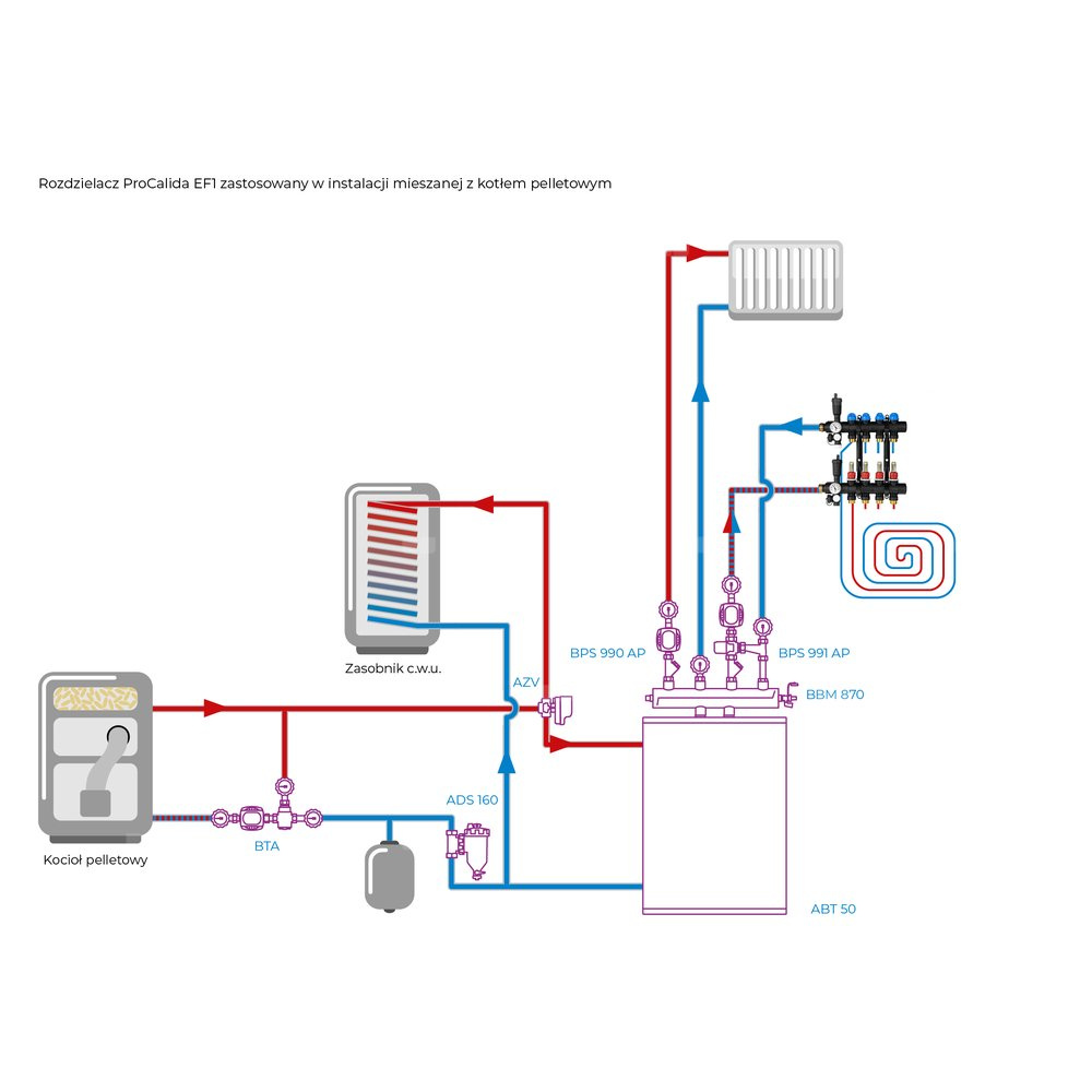 Rozprowadza ciepło/chłód ze źródła na poszczególne pętle instalacji płaszczyznowej.