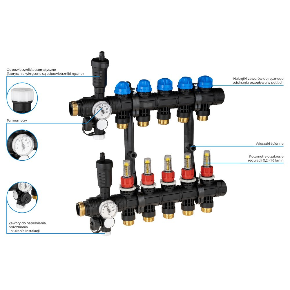 Rozprowadza ciepło/chłód ze źródła na poszczególne pętle instalacji płaszczyznowej.