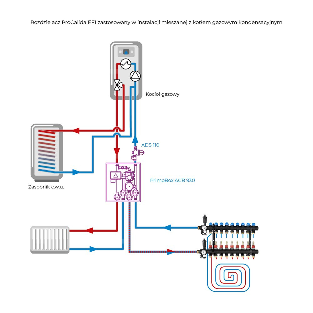 Rozprowadza ciepło/chłód ze źródła na poszczególne pętle instalacji płaszczyznowej.
