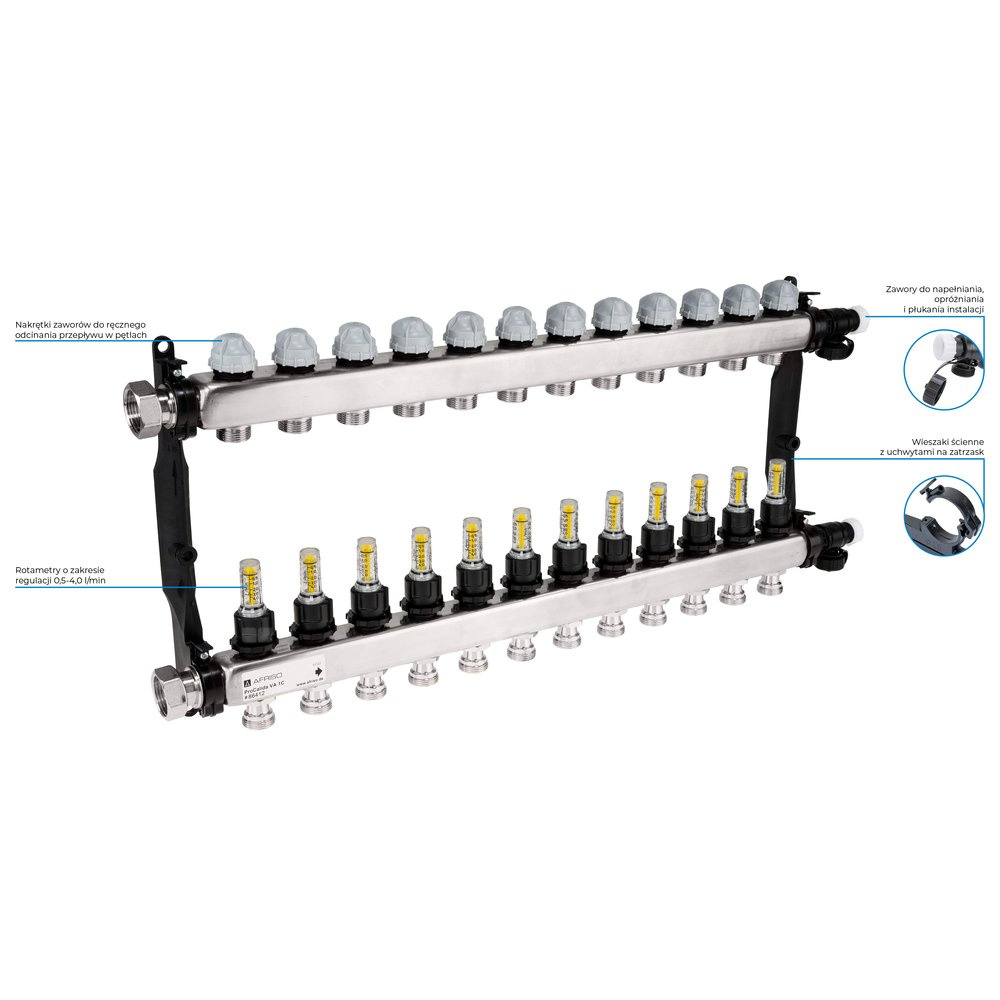 Rozdzielacz do ogrzewania podłogowego AFRISO ProCalida VA 1C 12-obieg. stal nierdzewna GZ 1'' x euroconus 3/4''
