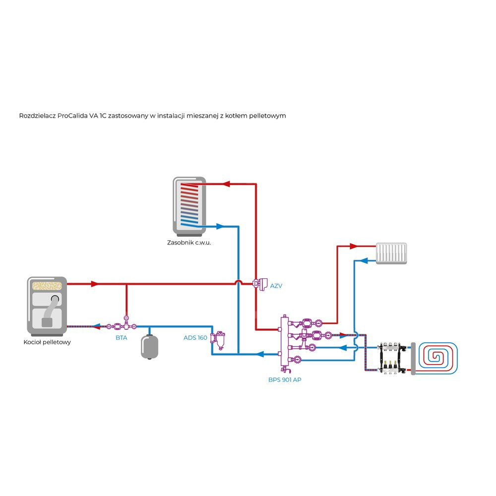 Rozprowadza ciepło/chłód ze źródła na poszczególne pętle instalacji płaszczyznowej.