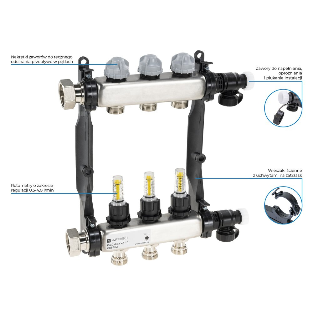 Rozdzielacz do ogrzewania podłogowego AFRISO ProCalida VA 1C 3-obieg. stal nierdzewna GZ 1'' x euroconus 3/4''