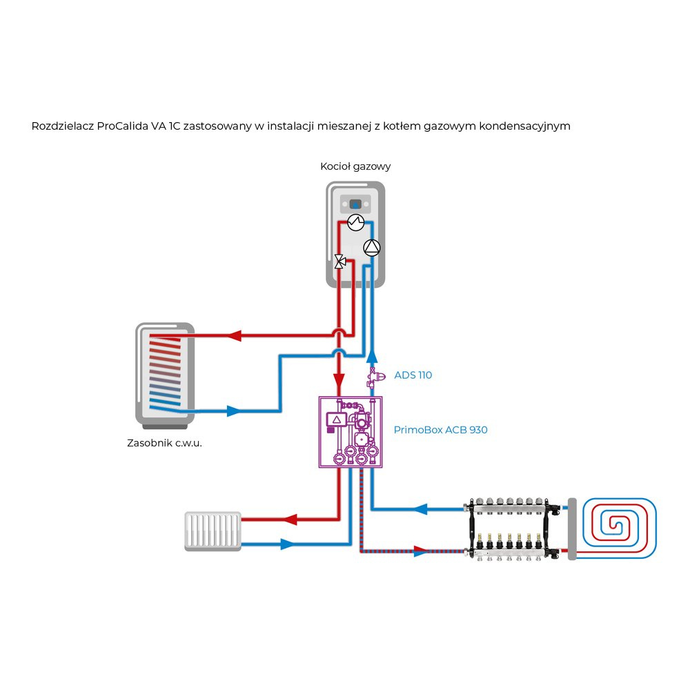 Rozprowadza ciepło/chłód ze źródła na poszczególne pętle instalacji płaszczyznowej.