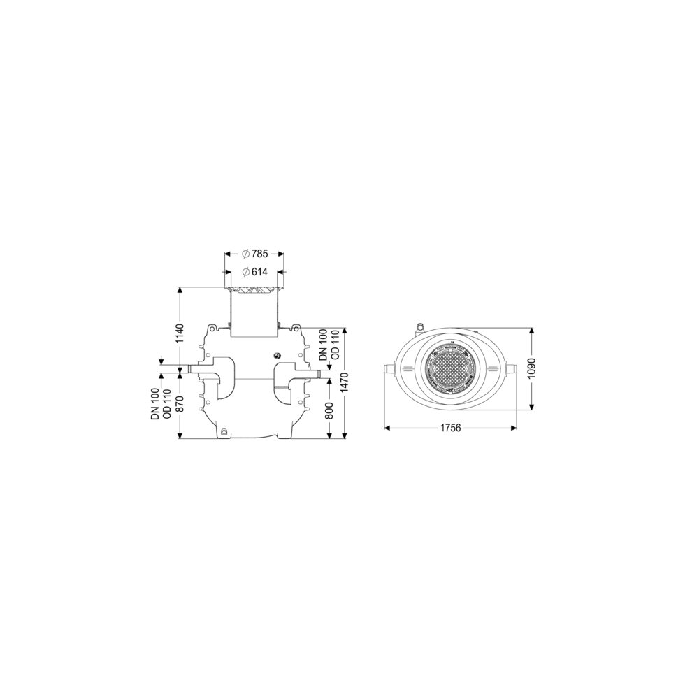 Odstęp między dnem rury dopływowej a dnem zbiornika: 870 mm