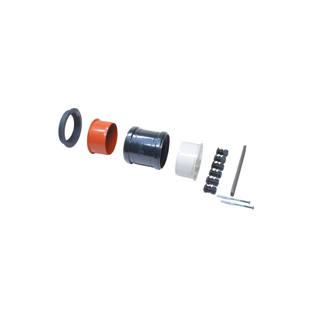 Zestaw uszczelniający do rury osłonowej na przewody elektryczne, pasujący do studzienek przeciwzalewowych LW 1000 i modułowych studzienek przeciwzalewowych LW 1000, składający się z uszczelki do przeprowadzenia przewodu rurowego, zaślepki, kielicha DN 100, zatyczki kielichowej HT, złączy śrubowych do dławic kablowych i pałąka ze śrubami.