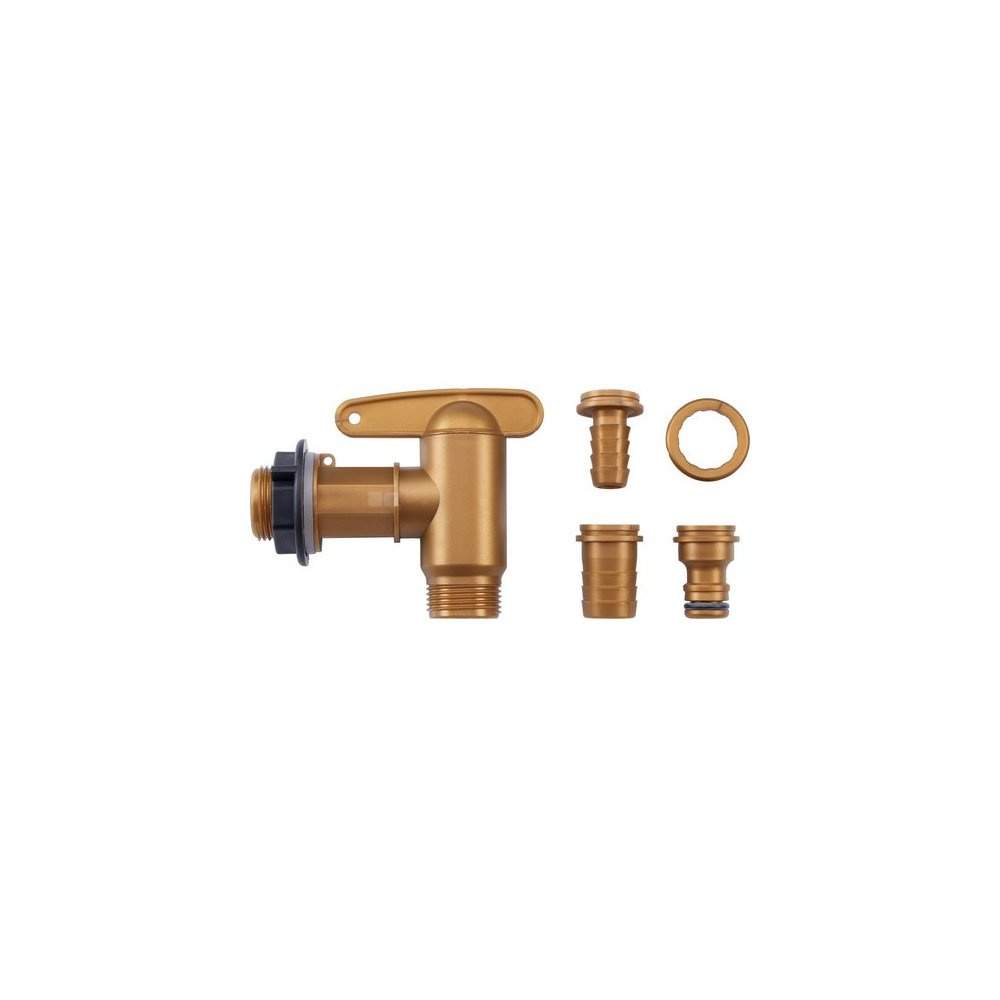 Aby woda mogła płynąć szybciej! Plastikowy kran z mosiężnym wykończeniem w kompletnym zestawie składającym się z: kranu z uszczelką i przyłączem śrubowym, elementów przyłączeniowych do standardowego złącza węża, nakrętek złącza węża 13mm (1/2") i węża 19mm (3/4") oraz uszczelek.