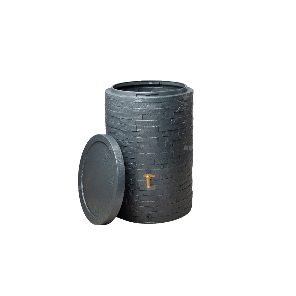 - Nowoczesny, kompaktowy i praktyczny zbiornik na wodę deszczową w realistycznym wykończeniu kamienia