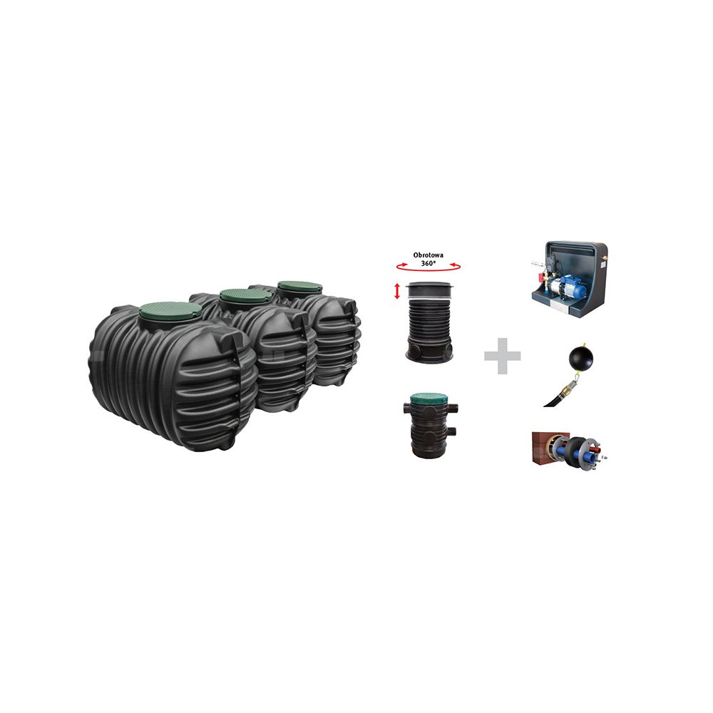 pakiet centrali DOM PREMIUM : moduł podawania wody kontroluje poziom wody w zbiorniku i automatycznie przełącza się na wodę z sieci wodociągowej, gdy zbiornik jest pusty, łatwy w instalacji wstępnie zmontowany moduł, 2 lata gwarancji, jest to moduł do ekstrakcji wody z zaworem zwrotnym i wężem z pływakiem, zawiera również wąż ssący 10 m, przejście przez ścienę z przelotami na rurę DN 100 i dwa przewody 1"). Filtr zewnętrzny w studzience DN400. Nadbudowa teleskopowa DN600 z regulacją H470-950 mm (3 x DN110) z dwuścienną pokrywą.